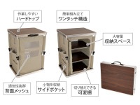 キャンプサイトをすっきりおしゃれに整頓できる。 ワンタッチで組み立てる大容量収納棚。
