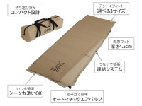 コンパクト収納&自動膨張で便利なエア式のキャンプマットに、ポリコットン生地のシーツを取り付けました。 シーツ部分は取り外して洗濯機で丸洗いできるため、いつでも清潔に使うことができます。 清潔さに加えて、厚みのあるウレタンフォームを入れることで、アウトドアであっても自宅のような快適な就寝環境を実現します。 はじめてのキャンプで眠れるか不安、という人におすすめの製品です。