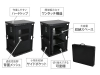 アタッシュケース型の収納状態から天板を持ち上げるだけで簡単に大容量の棚を作り出すことができます。 大容量な3段の棚はギアや調理道具を収納することができ、キャンプキッチンの整理整頓に役立ちます。 キャンプのリビングに設置すればギアを整理しサイトをスッキリとさせることが可能です。