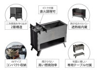 A4サイズに薄く折りたたみ、バイクに積載しやすい焚き火台。 二次燃焼機構を搭載し、拾った小枝でも煙が少なく快適な焚き火が楽しめます。 サイズ (約)W32×D14×H23cm 収納サイズ (約)W32×D23×H3cm 重量(付属品含む) (約)1.8kg 材質 製品本体、ゴトク、テーブル:ステンレススチール キャリーバッグ:ポリエステル 静止耐荷重 テーブル:10kg ゴトク:3kg セット内容 製品本体、バンド、ゴトク、テーブル、キャリーバッグ